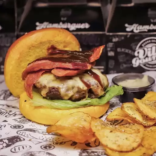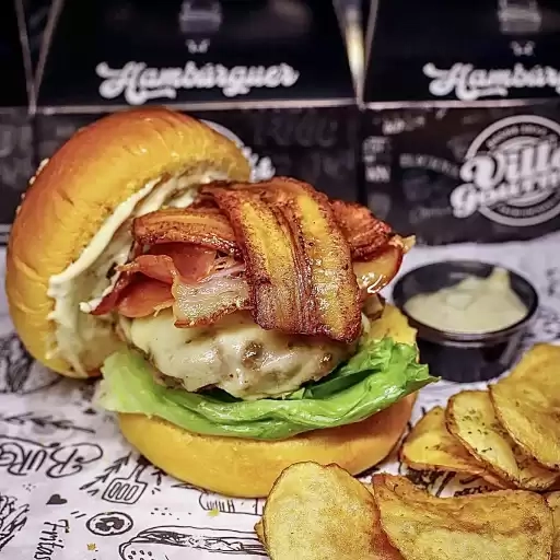 Pão brioche, maionese, burguer 160g grelhado, queijo mussarela e bacon. Acompanha batata chips e maionese da casa.