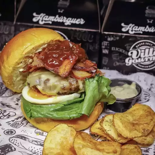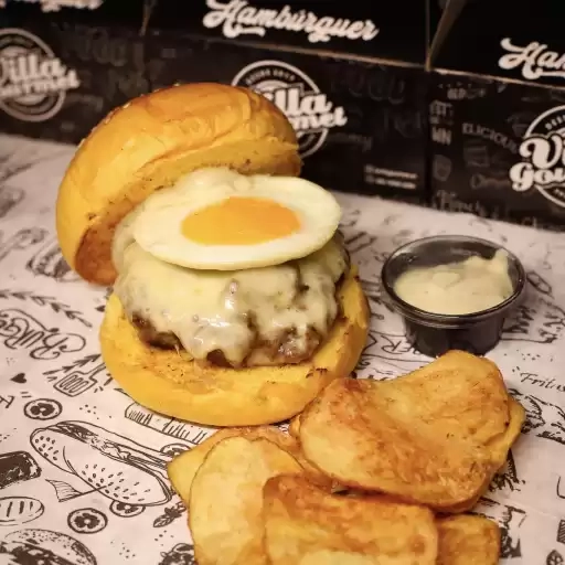 Pão brioche, maionese, blend de carne 160g grelhado, queijo mussarela e ovo. Acompanha batata chips e maionese artesana... Ver completo