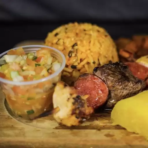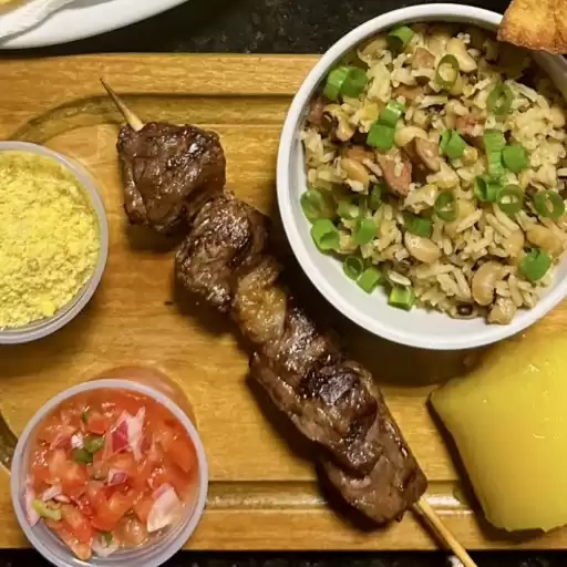 Acompanha arroz ou baião, macaxeira, farofa e vinagrete